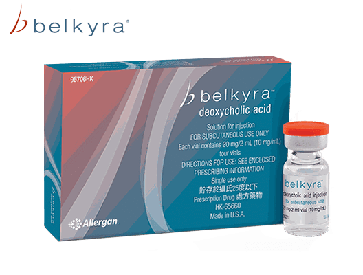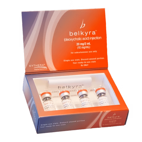 Belkyra is an injectable prescription drug containing deoxycholic acid-a molecule that naturally occurs within a human body. Deoxycholic acid plays a great role in the breakdown or absorption of dietary fats. When injected into the stubborn fat under the chin, Belkyra works by destroying fat cells; as a result, such cells cannot accumulate or store fat in the future.